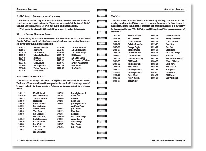Creation of annual directory for the Arizona Association of School Business Officials. A spiral bound book consisting of 200 pages with a 4 color cover and 8 pages of 4 color tabs. The interior pages were one color.